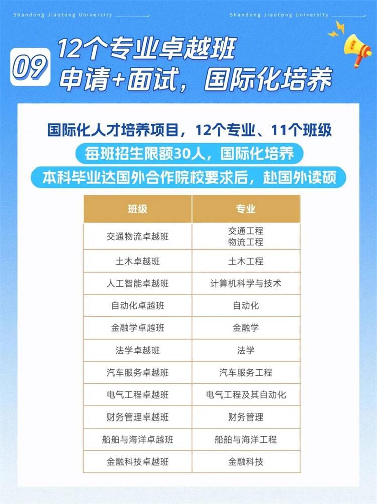 国际卓越学院开展本硕连读项目,共设11个班级,每班招生限额30人。我校普通本科专业学生入学后,通过个人申请和学院面试,达到入学要求后,可加入卓越班学习。卓越班聘用国际高端学术专家参与授课,对学生进行国际化培养,并采用更为灵活和合理的课程安排,在保证教学质量前提下,让学有余力的学生,提前完成四年制本科阶段学习,达到毕业要求,可获得山东交通学院本科毕业证和学士学位证。学生本科毕业当年达到国外合作院校入学要求,可赴国外进行至少1年硕士阶段的学习;本科毕业后,学生亦可选择国内考研或就业,发展前景更为广阔。