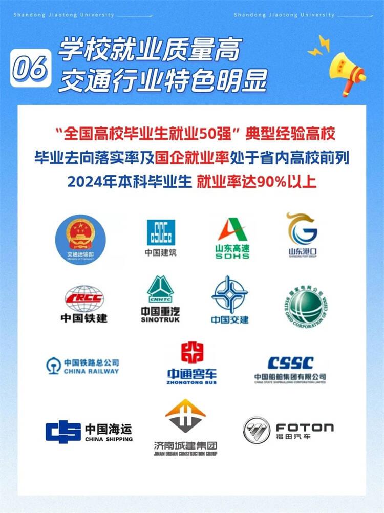 学校交通行业就业特色明显,与中交、中建、中铁、山东高速、中国重汽、中国能源、中国人保、济南重工、京东物流等行业知名企业长期保持合作。
