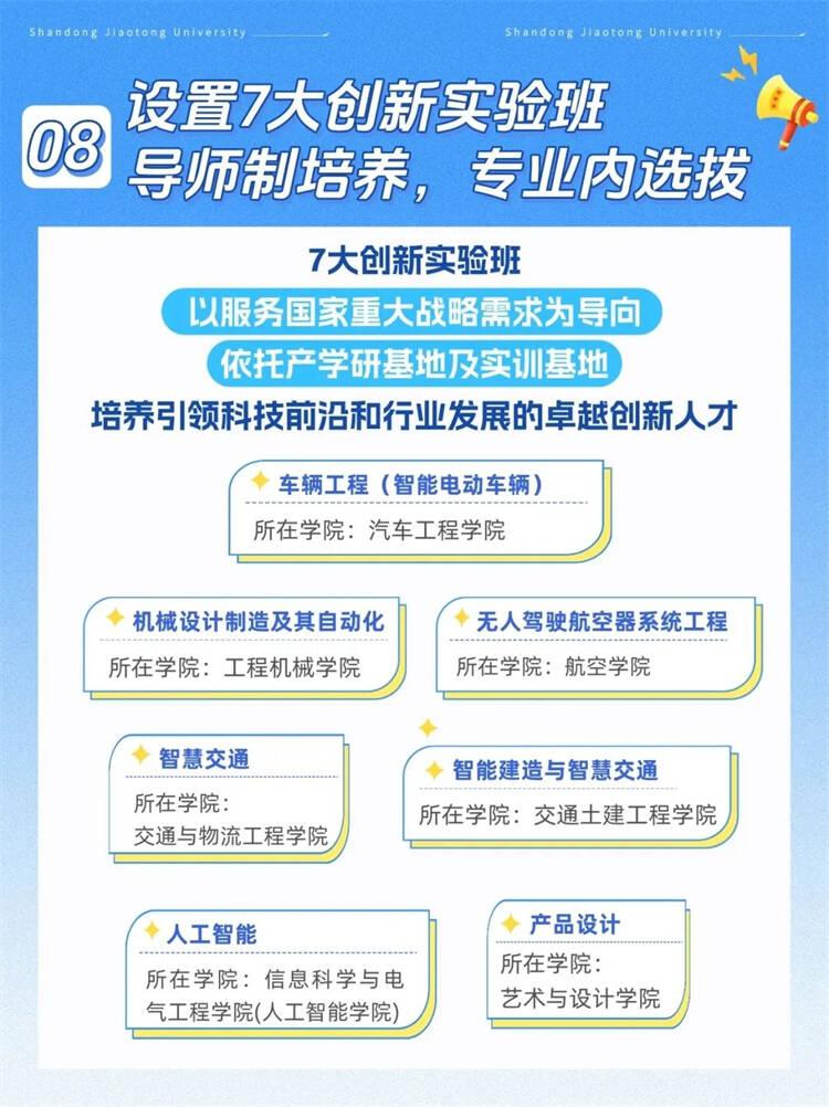 2025年学校共设置7个创新班,涵盖车辆工程、智能建造与智慧交通、机械设计制造及其自动化、智慧交通、人工智能、产品设计、无人驾驶航空器系统工程。以服务国家重大战略需求为导向,依托产学研基地及实训基地,培养引领科技前沿和行业发展的卓越创新人才,为全面建设社会主义现代化国家提供人才支撑。创新班均为导师制培养,在本专业内进行选拔,动态管理。