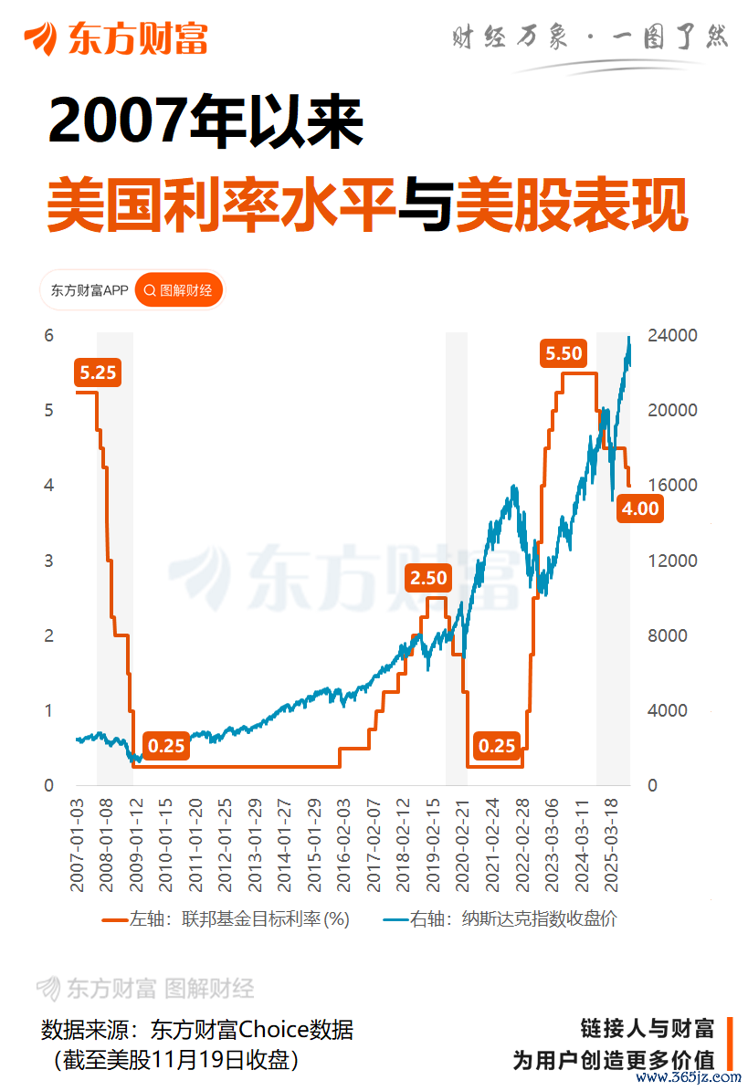FOMC在10月会议上以10比2的投票结果通过了降息25个基点的决定,将联邦基金利率目标区间下调至3.75%-4.00%。