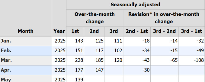 下图无疑就是最好的证明——按惯例,美国劳工部在非农当天公布最初的当月新增就业数据后,接下来两个月还会对数据先后进行两次修正。而可以看到,今年以来每个月的非农数据,都无一例外经历连续下修:第二次修正的数据小于第一次修正;第一次修正的数据小于初值……
