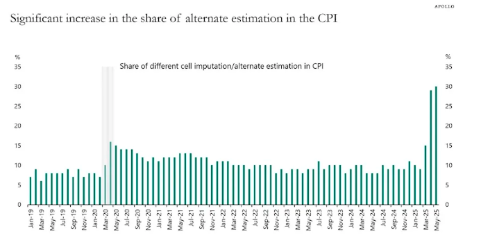 然而,一些业内人士指出,实际情况或许并不像官方所宣称的那样轻描淡写。阿波罗首席经济学家Torsten Sløk就指出,过去几个月中估算值占比显著增加,降低了数据质量。通常情况下,当数据无法获得时,约有10%的CPI数值是通过估算得出的。然而,五月份的估算比例大约是平均水平的三倍,达到了30%。
