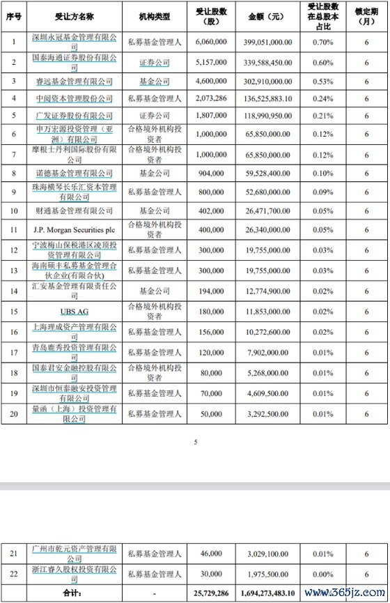 受让方为22名机构投资者,近3%的股份被合格境外投资者、基金管理公司、私募基金管理人、证券公司四方机构“分而食之”。这些机构多为各领域的知名机构。